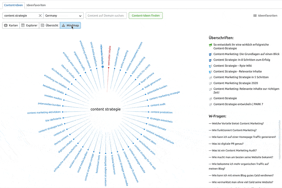 Wenn du das im Hinterkopf behältst, solltest du auf jeden Fall nach häufigen Fragen Ausschau halten, die Menschen zu deinem Thema stellen. In der Karten-Ansicht kannst du Fragen mit bestimmten Fragewörtern herausfiltern, wenn du deine Inhalte für eine bestimmte Suchintention anpassen möchtest.