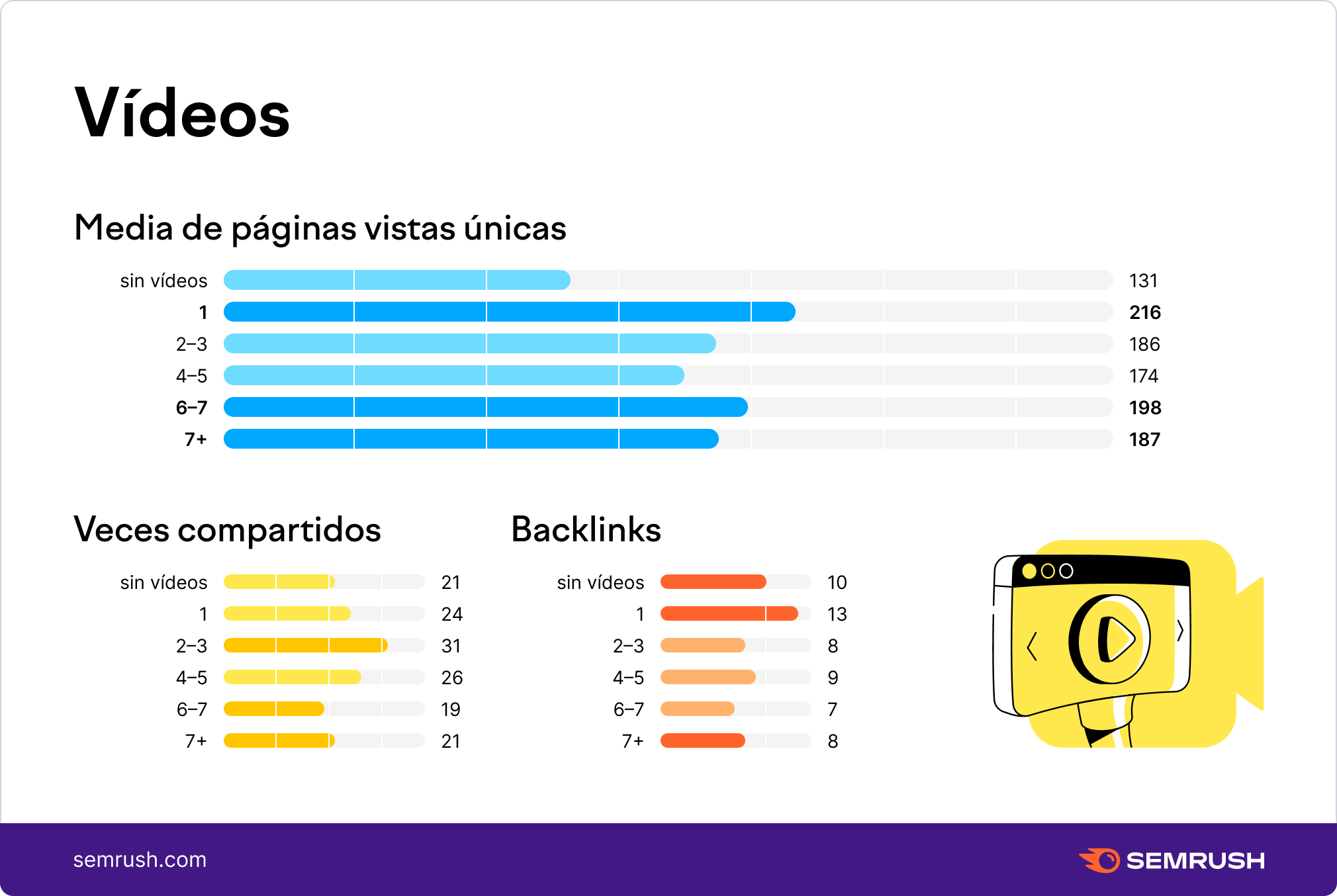 Conclusión: los artículos que no contienen un vídeo obtienen un 92% menos de tráfico y son un 24% menos compartidos que los que contienen al menos un vídeo.