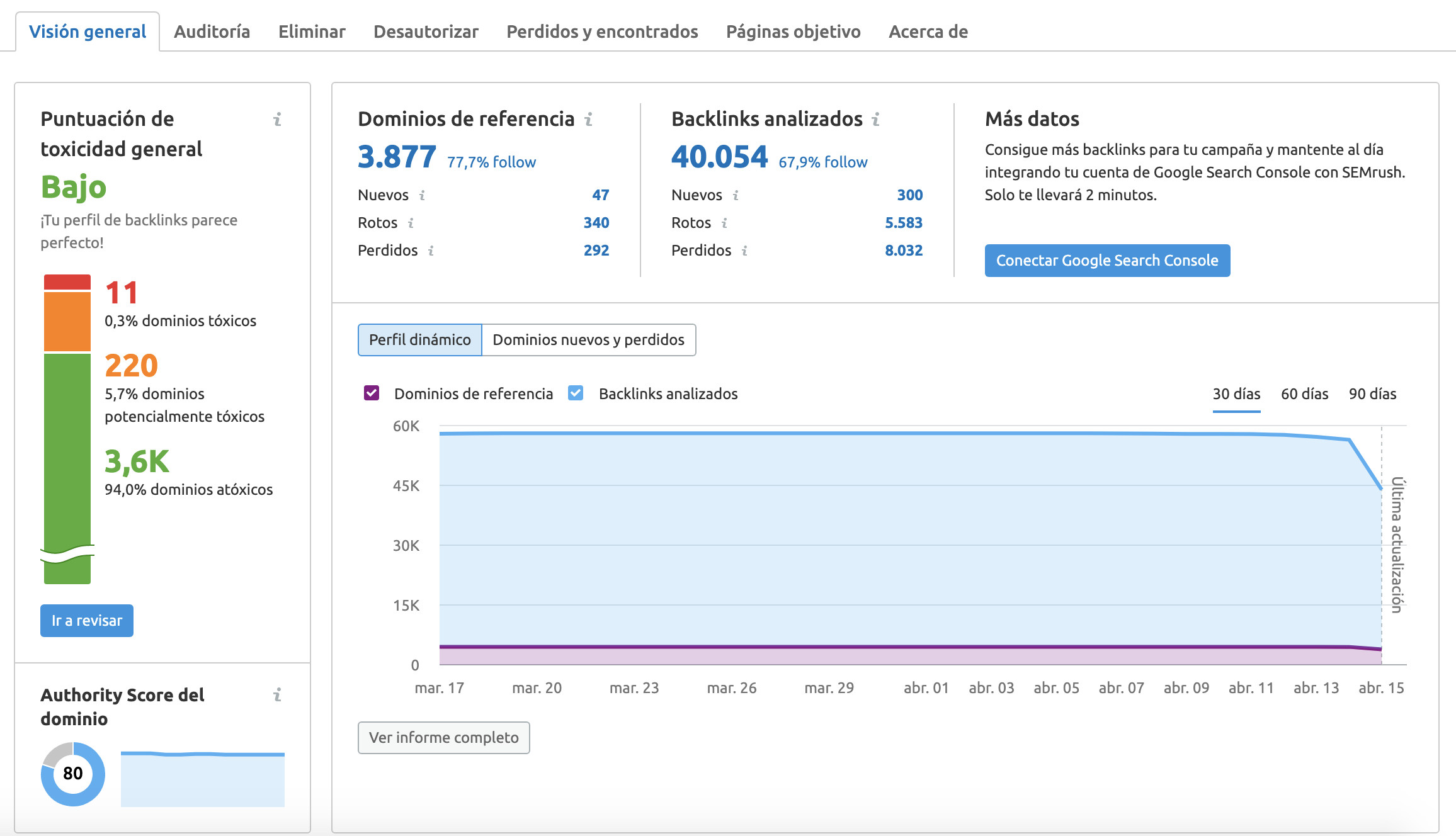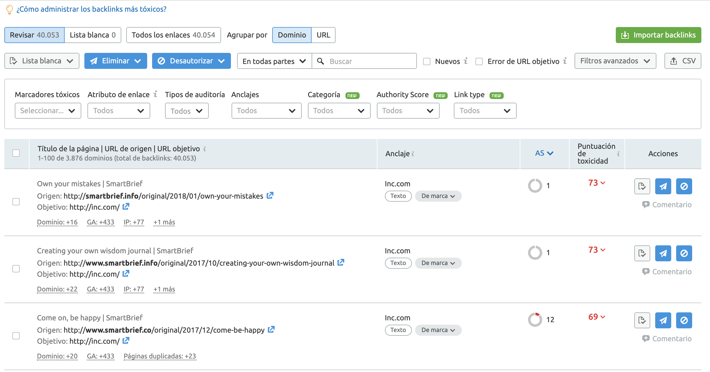 La puntuación de toxicidad general puede ser un fuerte indicador de que necesitas encargarte de enlaces o dominios específicos. Puedes añadirlos al archivo de desautorizar, o puedes eliminarlos para prevenir cualquier impacto negativo de estos enlaces.