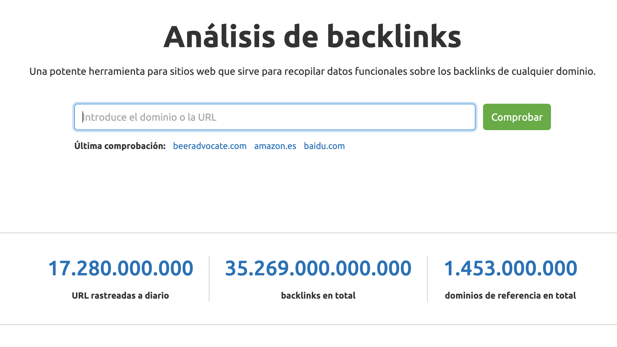 Puede ser tu propia web, una de tus competidores, o cualquier web cuyo perfil de enlaces quieras analizar. Si quieres visualizar qué enlaces apuntan a una página específica de un sitio, introduce la URL de esa página, incluso el dominio raíz (e.j. www.tuweb.com/pagina en lugar de solo www.tuweb.com).