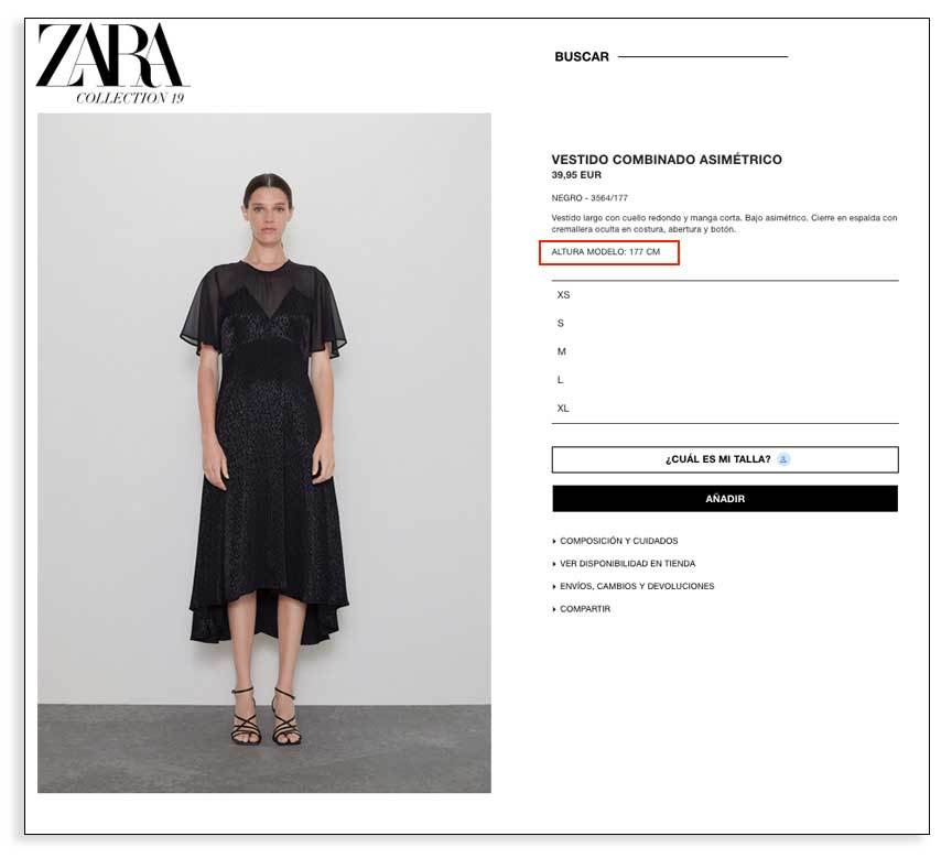 Si estás vendiendo ropa, ayuda mucho, mucho, que ofrezcas medidas orientativas, como hace Zara indicando la altura de las modelos.