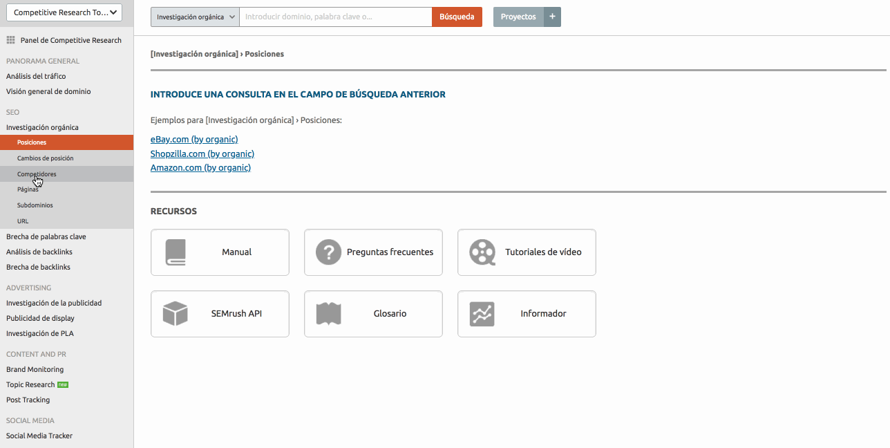 Para encontrar menciones de tu marca o de la de tus competidores para tu palabra clave objetivo, puedes utilizar la herramienta Brand Monitoring.