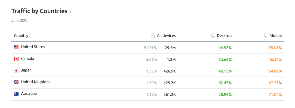 La herramienta de Market Explorer de SEMrush permite estudiar las características de la audiencia del nuevo mercado. Este nivel minucioso de datos te ayudará a prepararte para una expansión exitosa y evitar sorpresas desagradables.