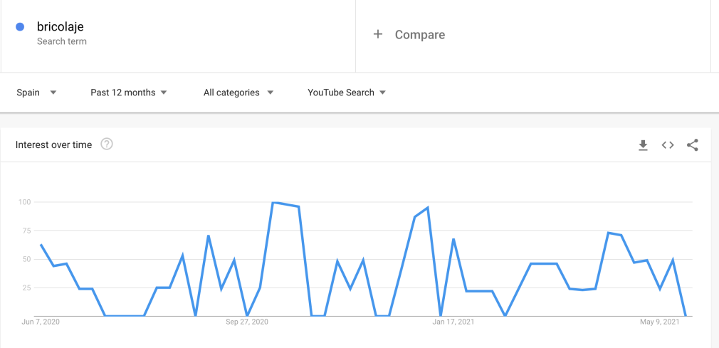 Por ejemplo, con la palabra clave "bricolaje", si seleccionas "Búsqueda de YouTube" en el desplegable del menú de la derecha, puedes ver cuándo buscan más los usuarios ese término. Si están planeando lanzar contenido sobre ideas de bricolaje, deberías hacerlo evitar los meses de verano.