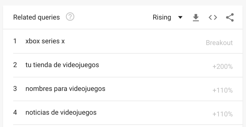 Por ejemplo, imagínate que quieres crear un artículo sobre "videojuegos". Si estás utilizando el modelo pilar / clúster para tu contenido, puedes utilizar la sección de consultas relacionadas en Google Trends para generar ideas para los temas de los clústeres.