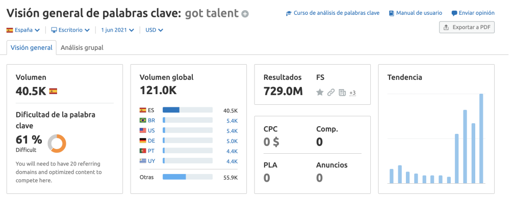 Para conseguir el contexto completo del volumen de búsqueda, deberías unir estos datos con los que extraigas al introducir la palabra clave en nuestra herramienta Visión general de palabras clave. De esta forma, podrás analizar el volumen de búsqueda exacto y cómo de difícil es posicionarte para esa palabra clave.