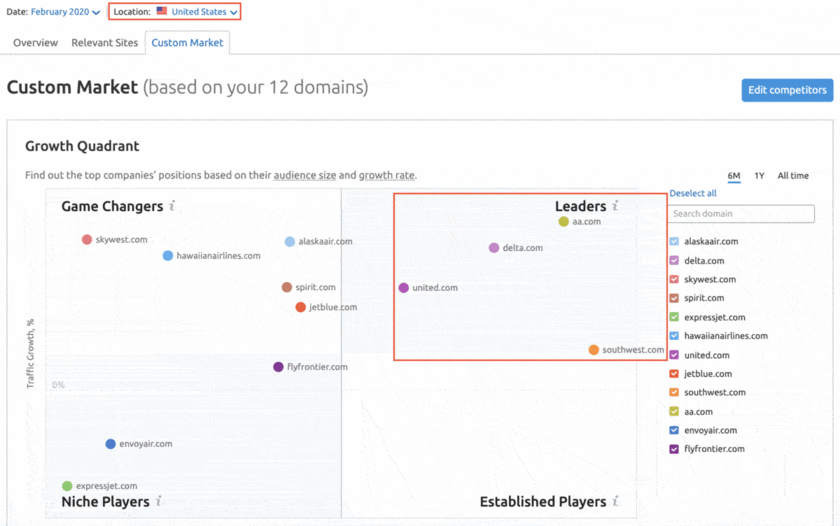 Se recomienda que te concentres en 10 competidores para un enfoque más preciso, algo que puedes lograr automáticamente a través de Market Explorer o manualmente a través de la función Custom Market si necesitas adaptar tu Growth Quadrant.