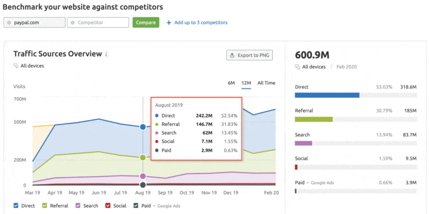 Si hacemos clic en la descripción general de las fuentes de tráfico de PayPal, podemos ver que aumentó sus esfuerzos de marketing en agosto de 2019 y aumentó su tráfico en todos los ámbitos: