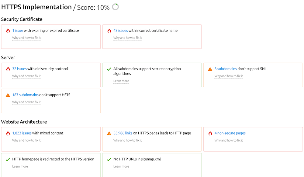 La herramienta de Auditoría del sitio es útil para la implementación de HTTPS. Te muestra cualquier problema que puedas tener y ofrece recomendaciones para solucionarlo.