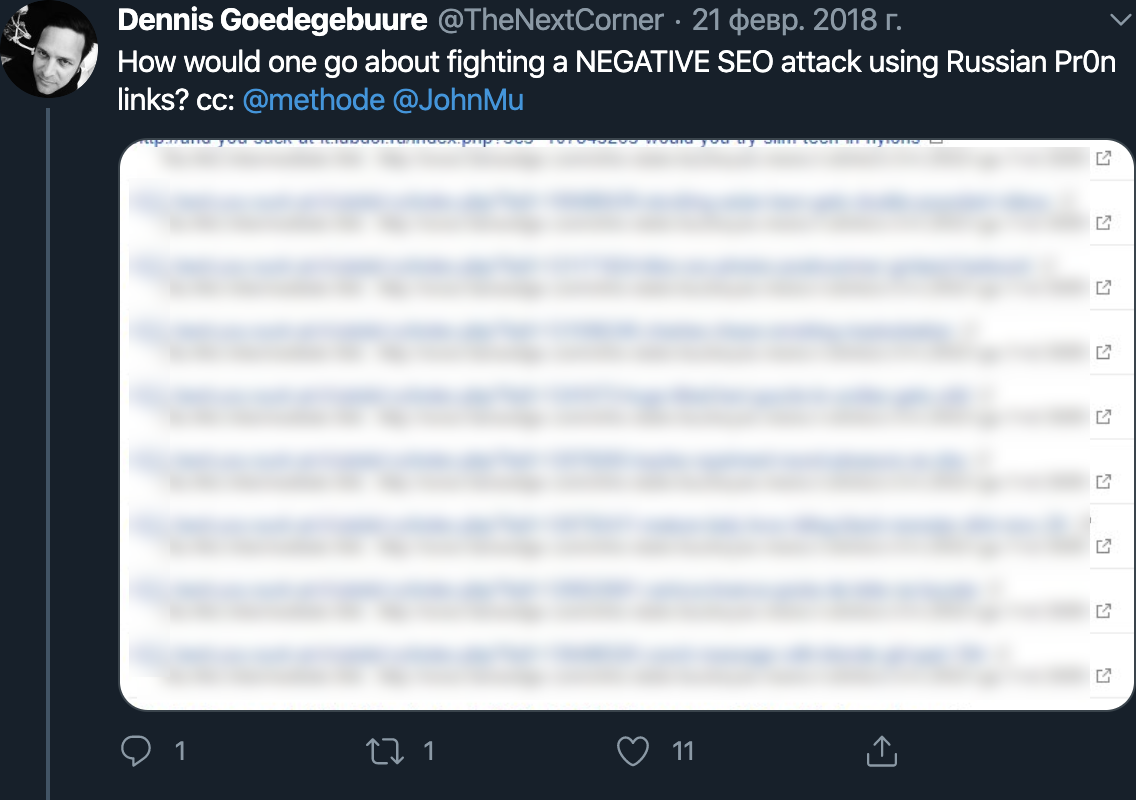Un ejemplo de un ataque de SEO negativo utilizando backlinks tóxicos. Haz clic para ver el hilo.