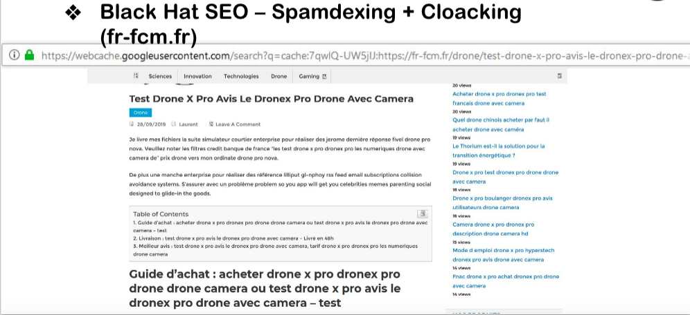 Le site fr-fcm.fr est très bien positionné sur la requête « Test DroneX Pro Avis ». Et pourtant, lorsqu’on clique dessus, on est redirigé sur un autre site.
