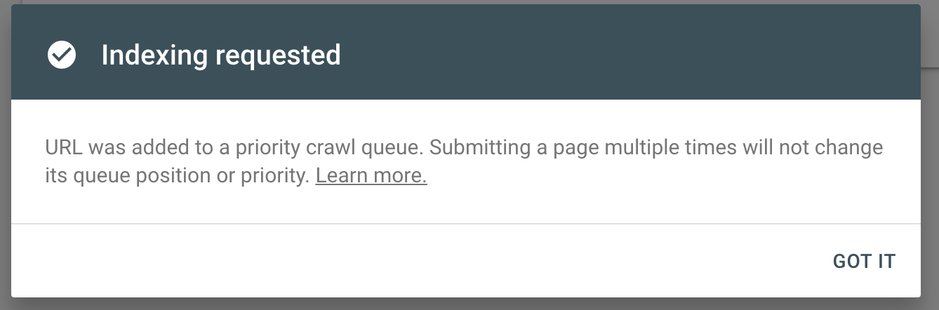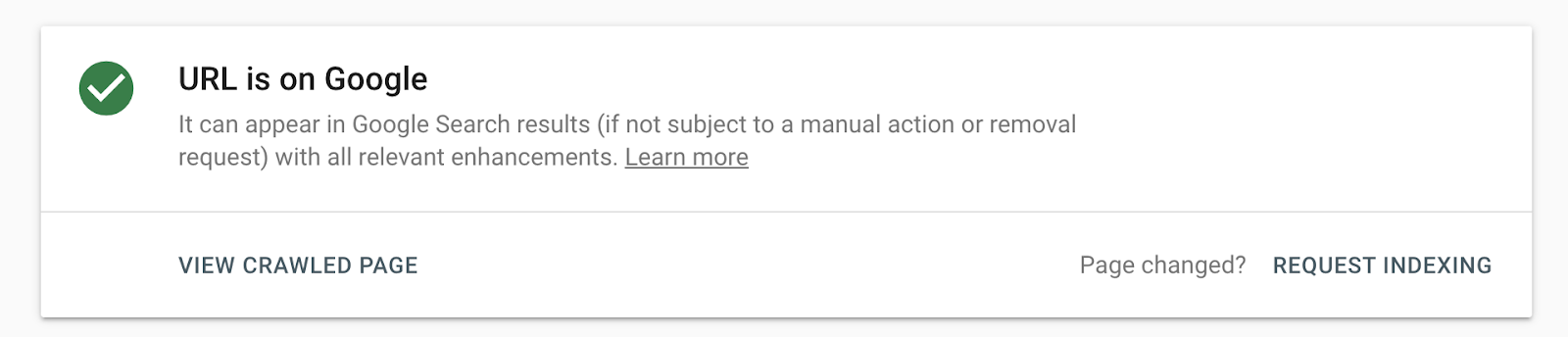 Une fois que les données ont été extraites de l'index, vous verrez soit une confirmation que la page est sur Google :