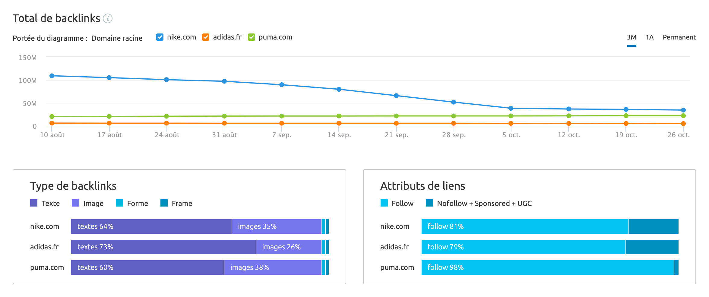 - Trouvez les principales sources de backlinks : L'autre façon de prendre de l'avance sur vos concurrents est de comprendre où ils produisent des backlinks. En utilisant notre outil Analyse de backlinks, vous pouvez comparer le nombre total de backlinks entre cinq URL concurrentes ainsi que des détails utiles comme le fait de savoir si ces liens sont des liens follow et des domaines référents uniques.