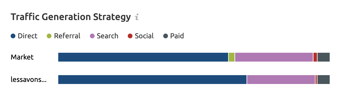 Outre un Growth Quadrant identifiant les compagnies leaders en terme d’audience et de potentiel, Market Explorer vous fournit la répartition du trafic total du secteur entre ces entreprises, mais aussi des insights très intéressants comme cet aperçu de leurs canaux d’acquisitions de trafic préféré (direct, referral, search, social ou payant?) ou de la répartition de leur audience, qui s’avère dans notre exemple - et sans surprise - plutôt féminine et âgée de 25 à 34 ans.