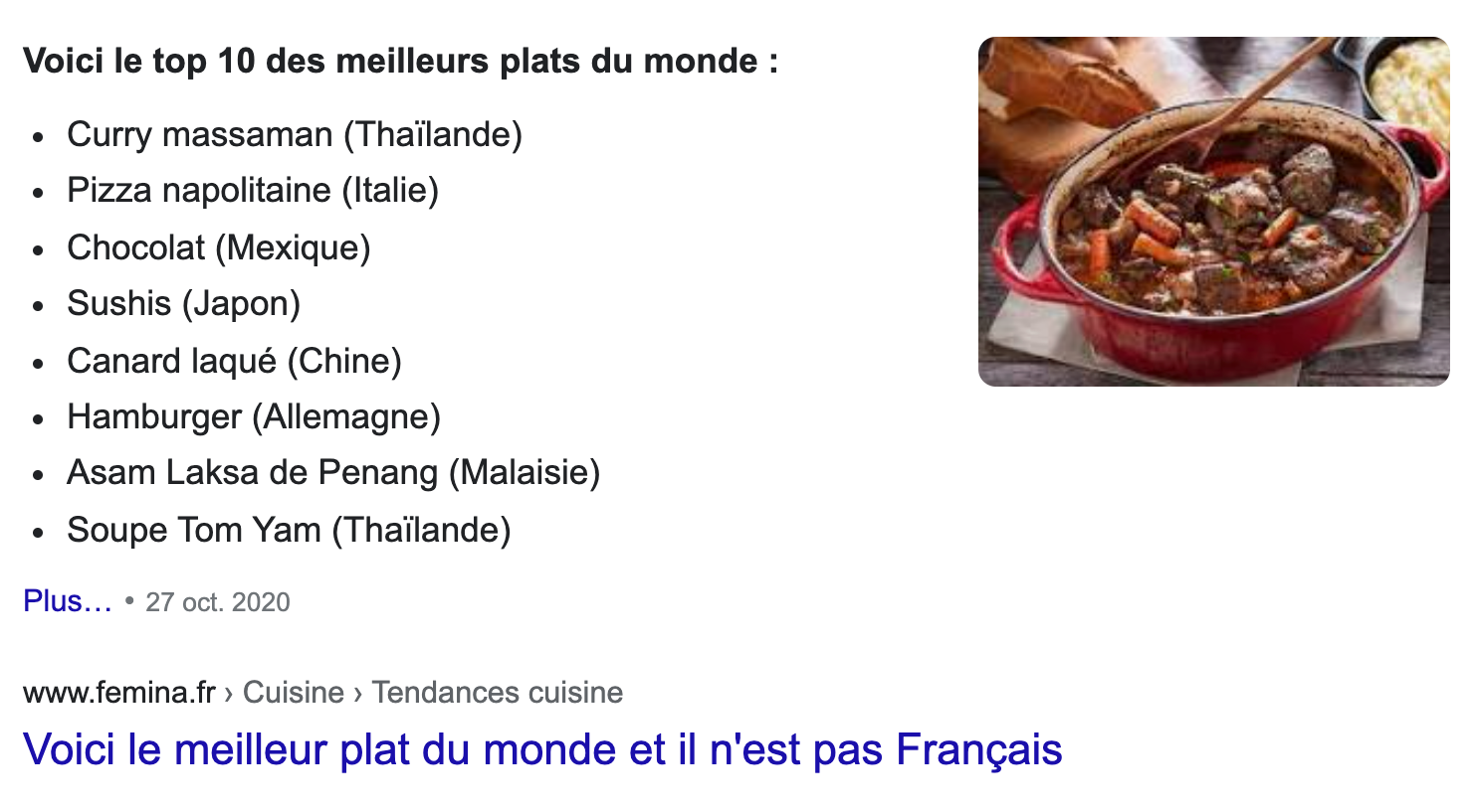 Si vous avez écrit un contenu que Google sélectionne comme featured snippet, vous apparaissez automatiquement en haut des SERP. Pour optimiser pour les featured snippets, vous devez d'abord trouver les SERP avec un snippet. Vous pouvez également vérifier quels types de featured snippets Google affiche pour ce terme, par exemple, une liste à puces ou numérotée ou bien un paragraphe. Vous structurerez ensuite votre texte en conséquence. Pour ce qui est du style, privilégiez une rédaction claire et concise avec des sous-titres bien pensés.