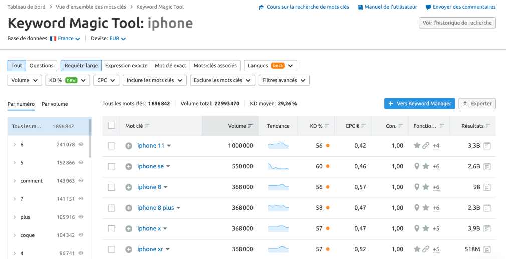 Keyword Magic Tool : Construisez une liste principale de mots clés