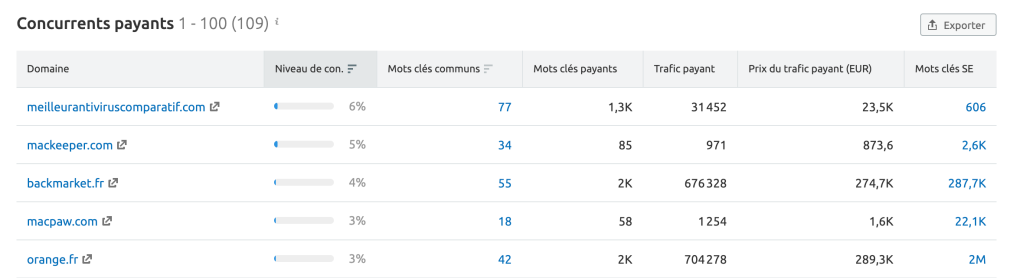 Vous trouverez ci-dessous un tableau répertoriant les Concurrents payants du domaine analysé.