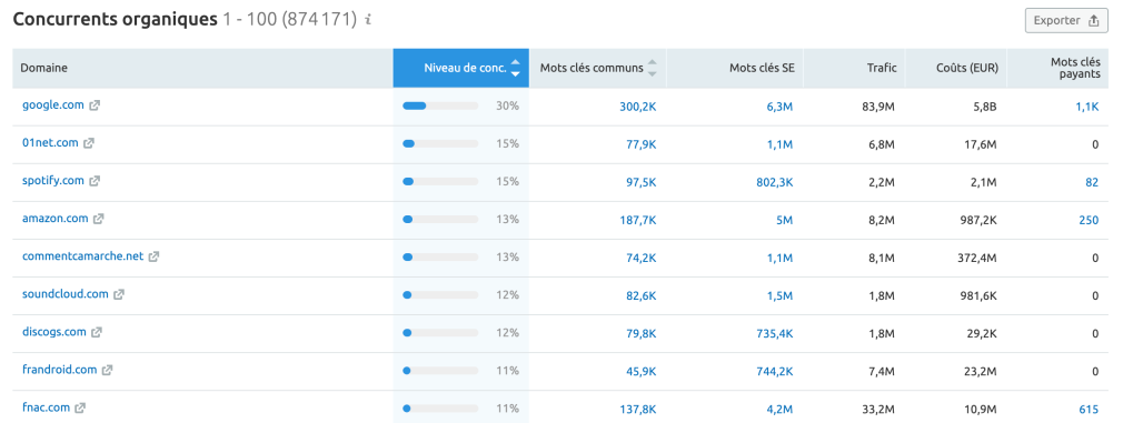Vous disposez maintenant d'une liste de vos concurrents, qui vous serviront de domaines racines. La liste est triée par Niveau de concurrence — cette métrique montre à quel point le site web est proche de celui que vous avez saisi ; elle est basée sur le nombre total de mots clés pour lesquels le concurrent est classé et le pourcentage de mots clés qu'il partage avec le site web en question.