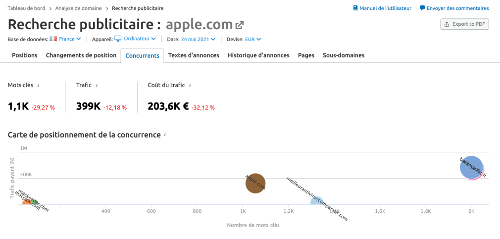 En haut du rapport, vous pouvez voir une Carte de positionnement de la concurrence. Cette visualisation est basée sur le Trafic de recherche payante du domaine et le Nombre de mots clés payants, ce qui donne un bon aperçu du paysage de la concurrence dans la recherche payante.