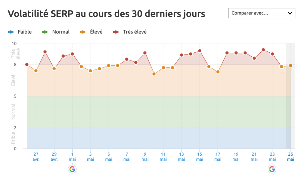 Semrush Sensor peut mesurer la volatilité des résultats de recherche pour vos mots clés afin de vous aider à réagir à toute fluctuation soudaine. Qu'il s'agisse d'un résultat de l'algorithme de Google ou d'un événement survenant dans votre secteur, vous serez le premier à le savoir.