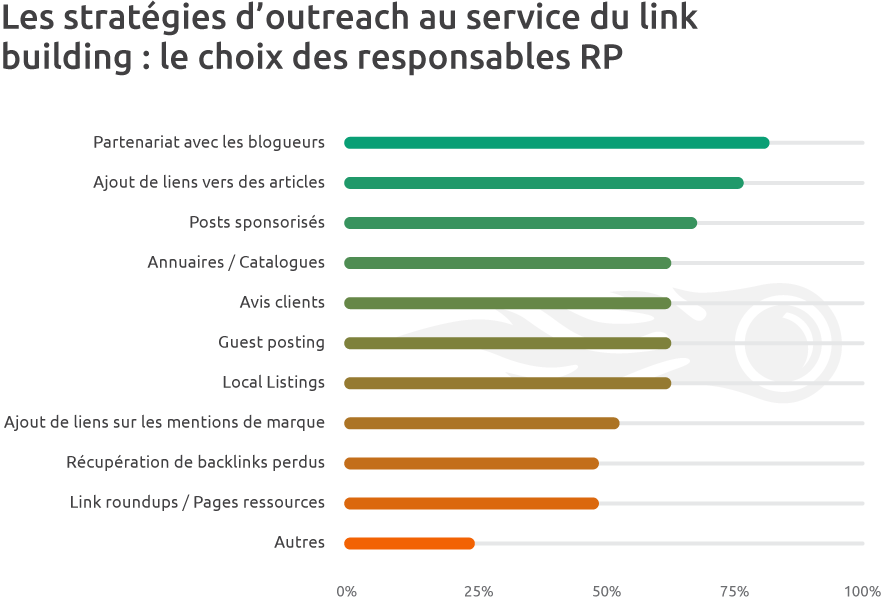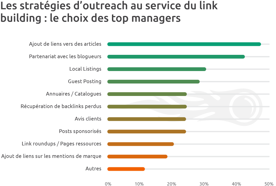 Les référenceurs SEO ont une nette préférence pour le guest posting et l’ajout de liens vers des articles : des moyens simples à mettre en œuvre et qui peuvent aider à étoffer un robuste portefeuille de backlinks s’ils sont bien réalisés. La sollicitation de blogueurs se situe en 3e position.