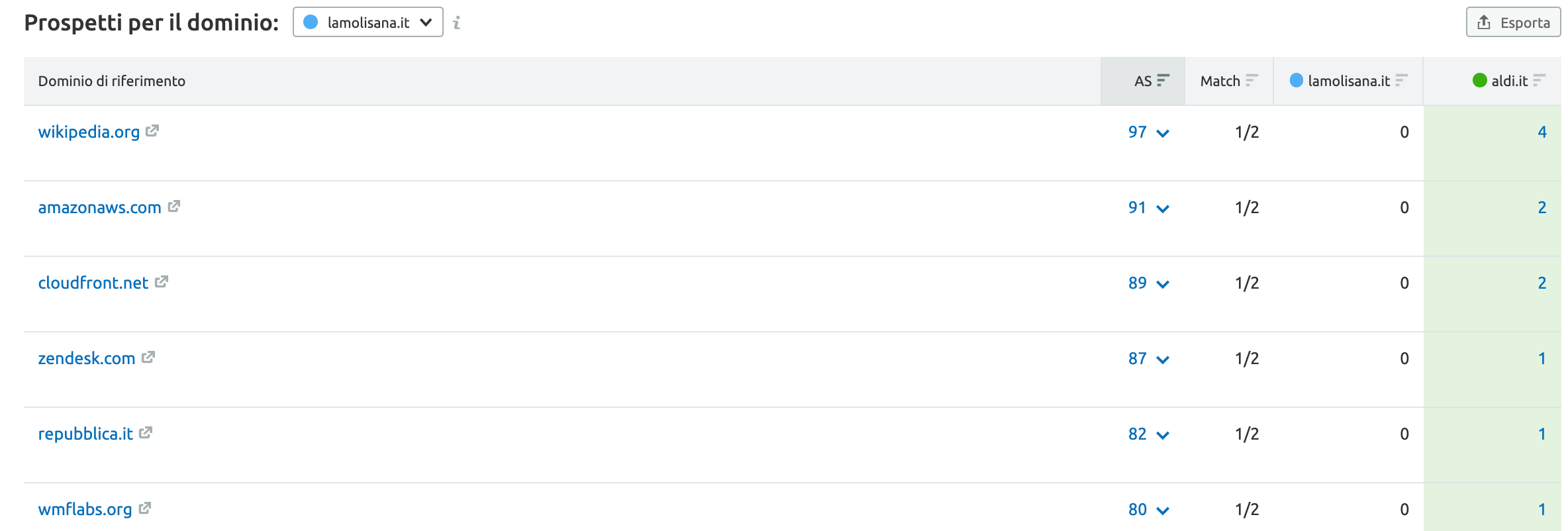 Ordinando questi domini in base al punteggio di autorità (AS), puoi creare un elenco dei domini più interessanti da contattare per migliorare il tuo profilo backlink. Assicurati che siano rilevanti per il tuo settore.