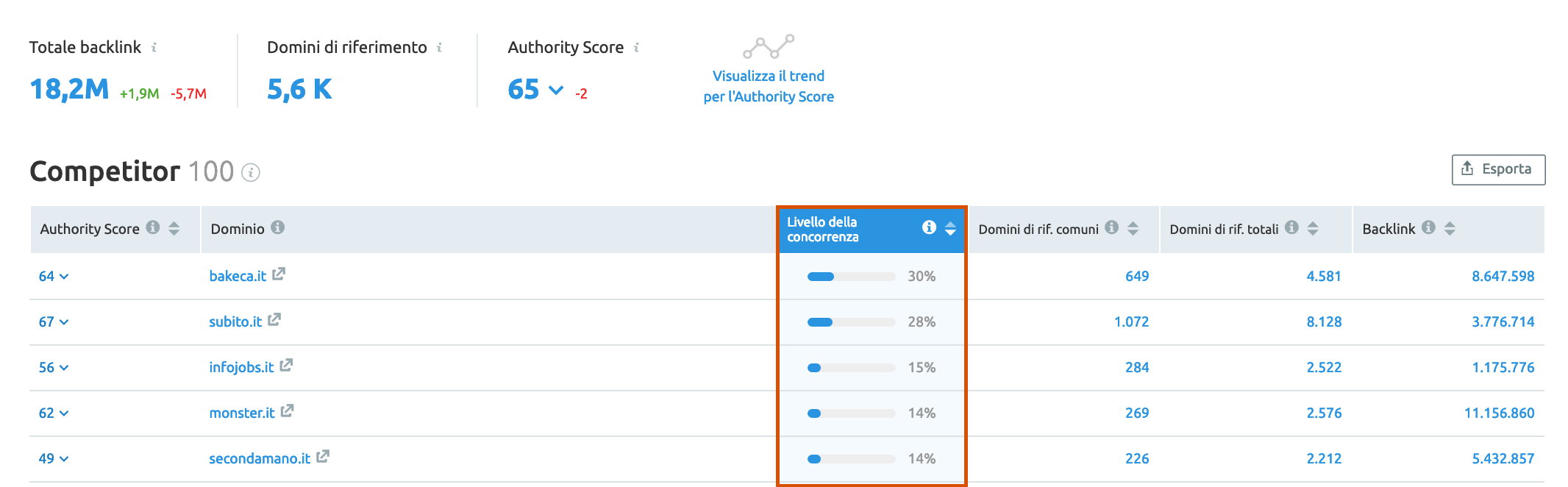 Nota: AS è la nostra metrica proprietaria che indica la domain authority. Si basa su: numero di backlink, domini di riferimento, traffico organico e altri dati importanti dal punto di vista della SEO.