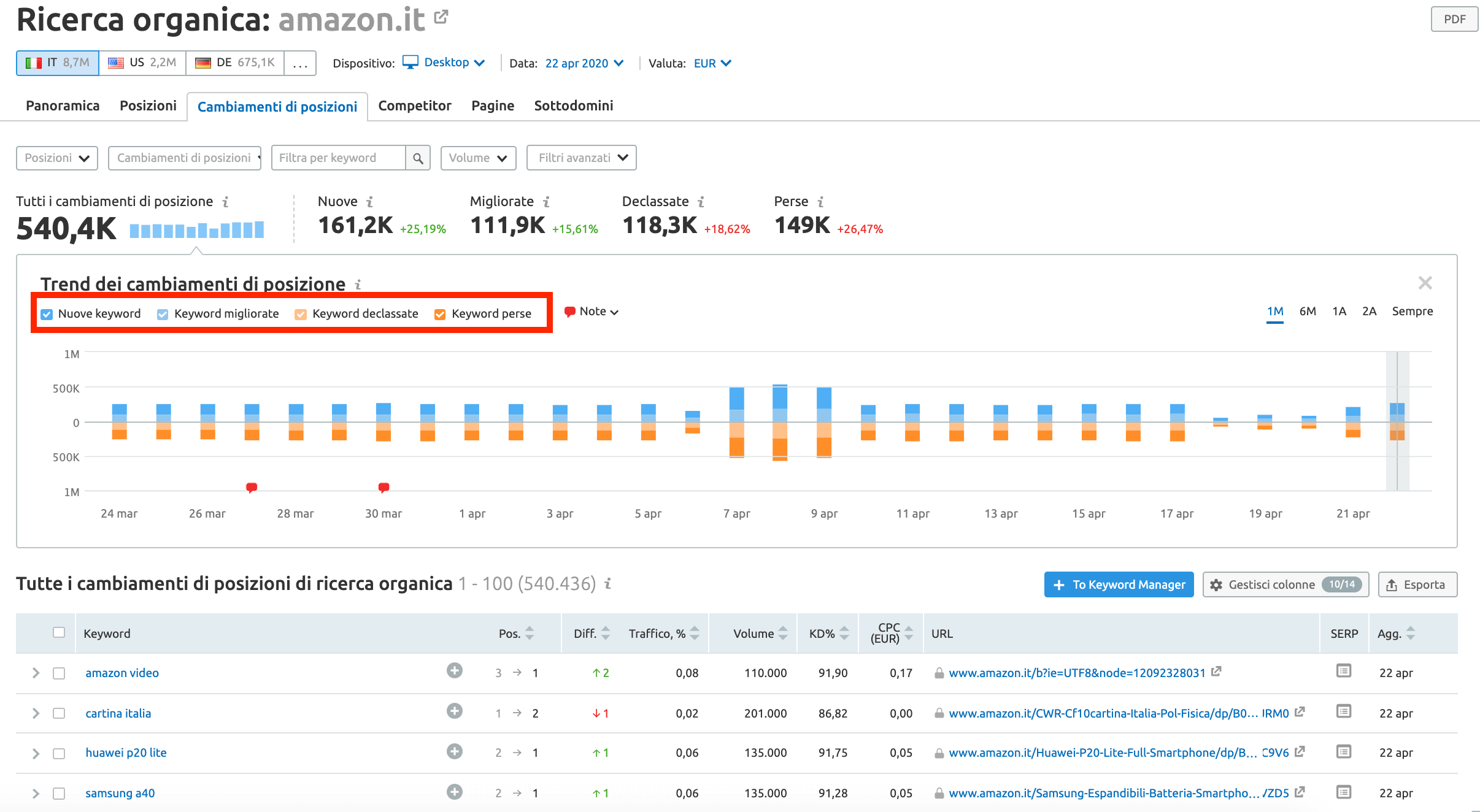 Puoi trovare tutte queste informazioni nel report Cambiamenti di posizioni. I picchi sul grafico ti permettono di vedere improvvisi cambiamenti nella situazione dei tuoi concorrenti. Cliccando su un picco e ordinando i risultati, ad es. per posizione, scoprirai quali parole chiave hanno subito più modifiche.