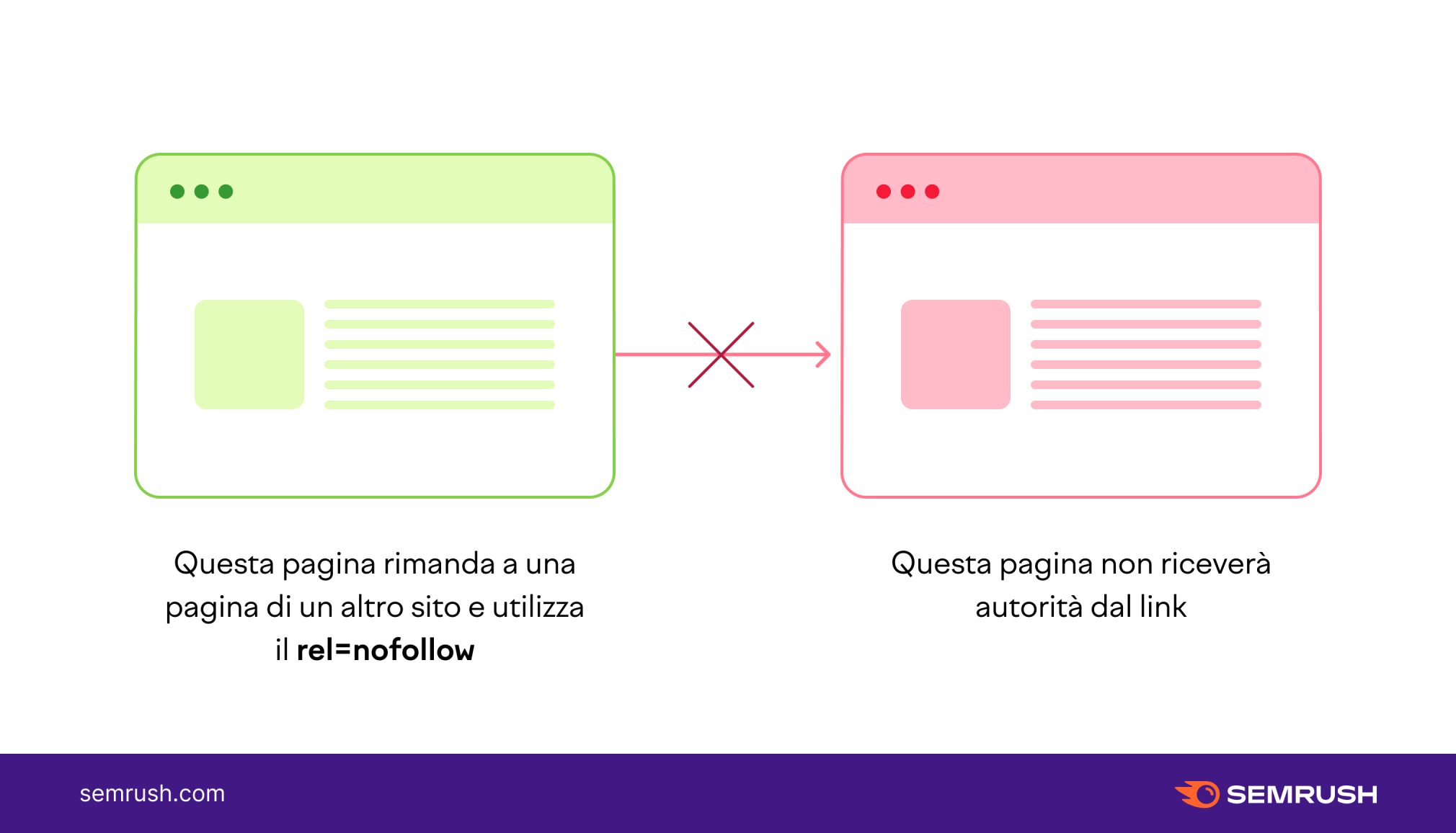 I link nofollow utilizzano l'attributo rel="nofollow" per informare Google e gli altri motori di ricerca che non devono trasmettere fiducia (PageRank). Un backlink nofollow si presenta in questo modo: