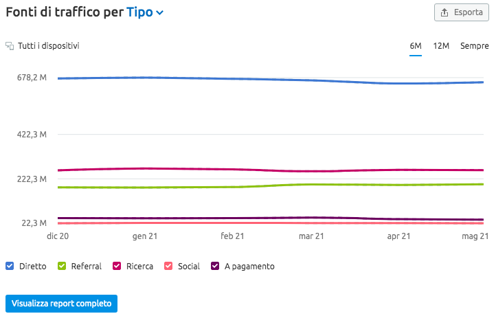 Se stai partendo da zero, puoi lavorare con l'analisi della concorrenza per comprendere le parole chiave e gli argomenti che i tuoi competitor stanno già usando. Il nostro strumento Analisi traffico nella soluzione Semrush .Trends aiuta a identificare il traffico che i tuoi principali concorrenti ricevono dai social media.