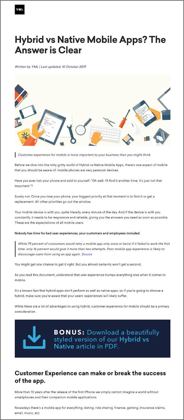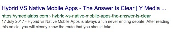 La parola chiave è “Native vs hybrid app”, mentre il title tag riporta “Hybrid VS Native Mobile Apps”.
