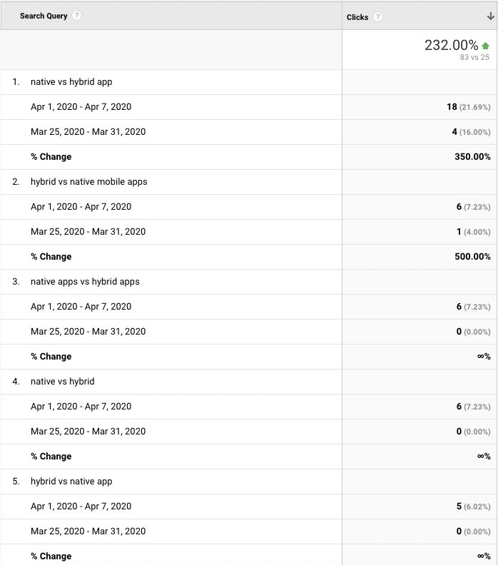 Come puoi vedere, per la parola chiave “native vs hybrid app”, una pagina del sito del mio cliente è apparso 599 volte su Google nell’ultima settimana, ma ha ottenuto solo 20 click.