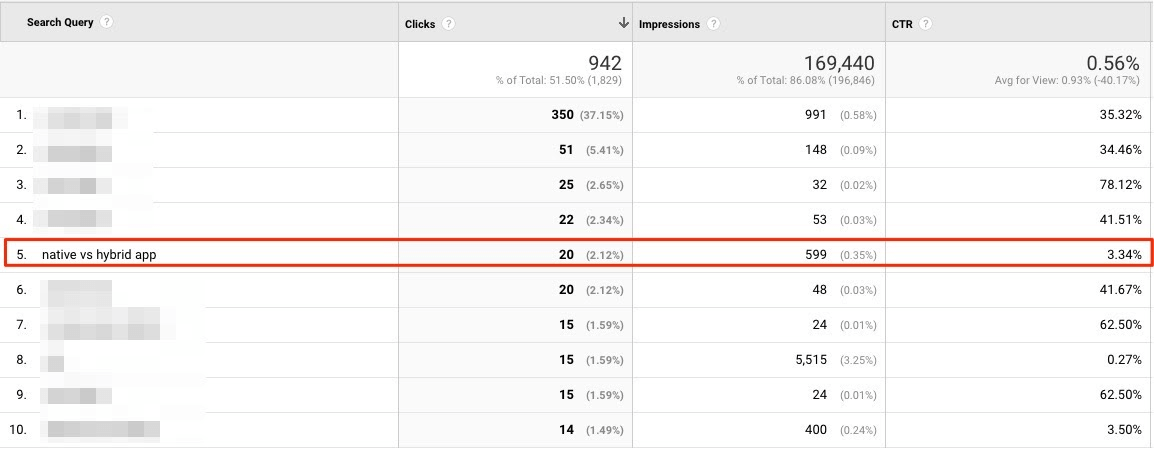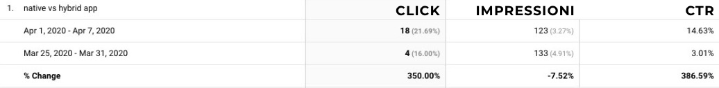Infatti, il CTR per la keyword principale (native vs hybrid apps) è aumentato del 386%:
