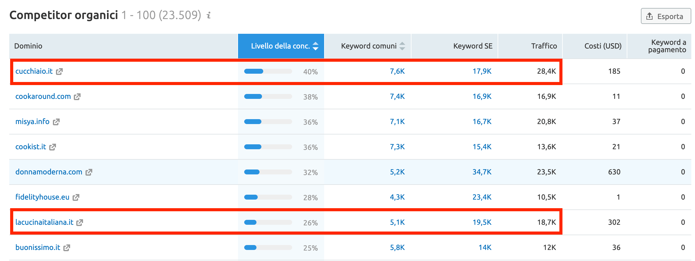 Con il rapporto sui Competitor di Ricerca organica puoi determinare chi sono i tuoi principali concorrenti e quante parole chiave condividi con loro. Inizia con i concorrenti con cui hai più parole chiave in comune e con un'elevata quantità di parole chiave e traffico totali.