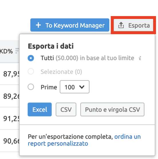 A questo punto puoi esportare i dati in Excel, CSV o Punto e virgola CSV e iniziare a filtrare per trovare parole chiave utili alla tua attività per le quali non hai i contenuti adeguati per posizionarti.