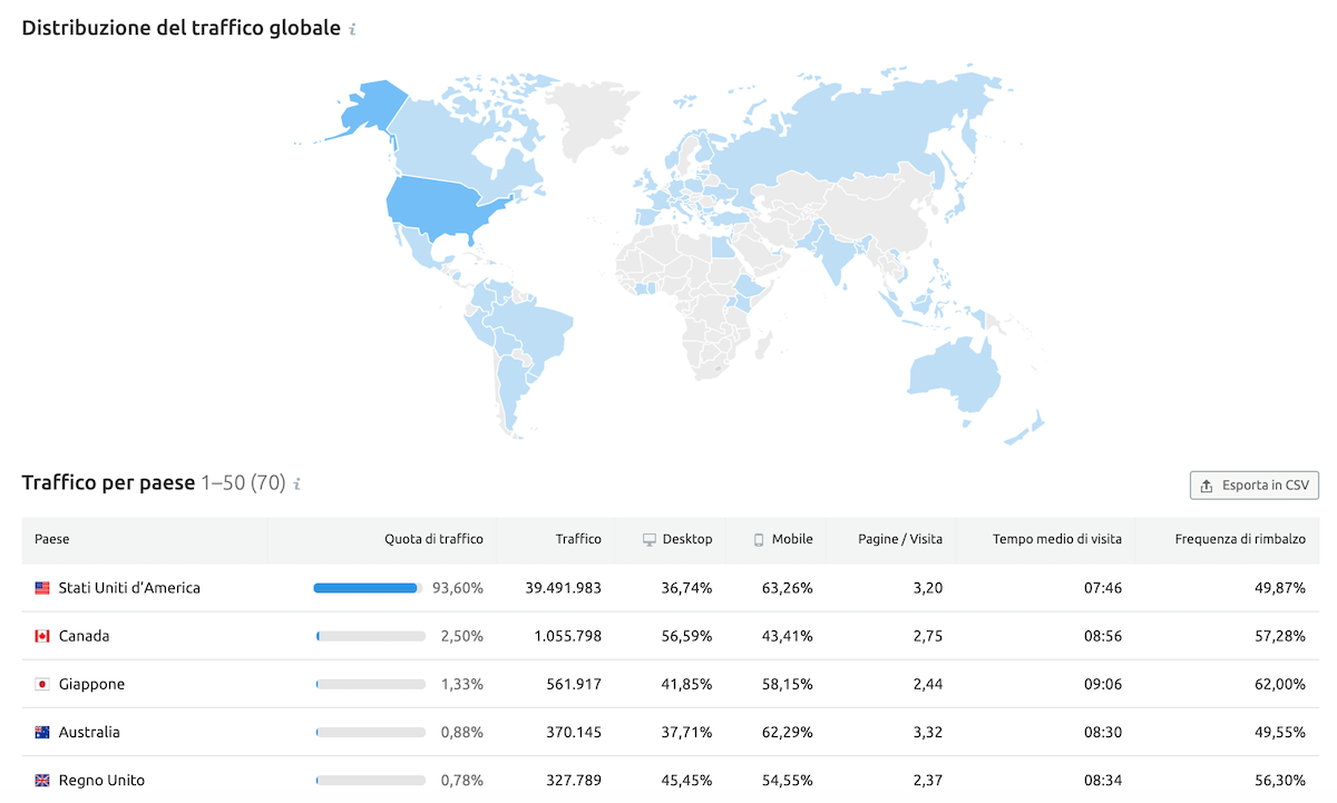 La maggior parte delle piattaforme traccia la distribuzione del traffico in base alla posizione, mostrando da dove proviene, cosa succede a quel traffico all'arrivo e in che misura converte.