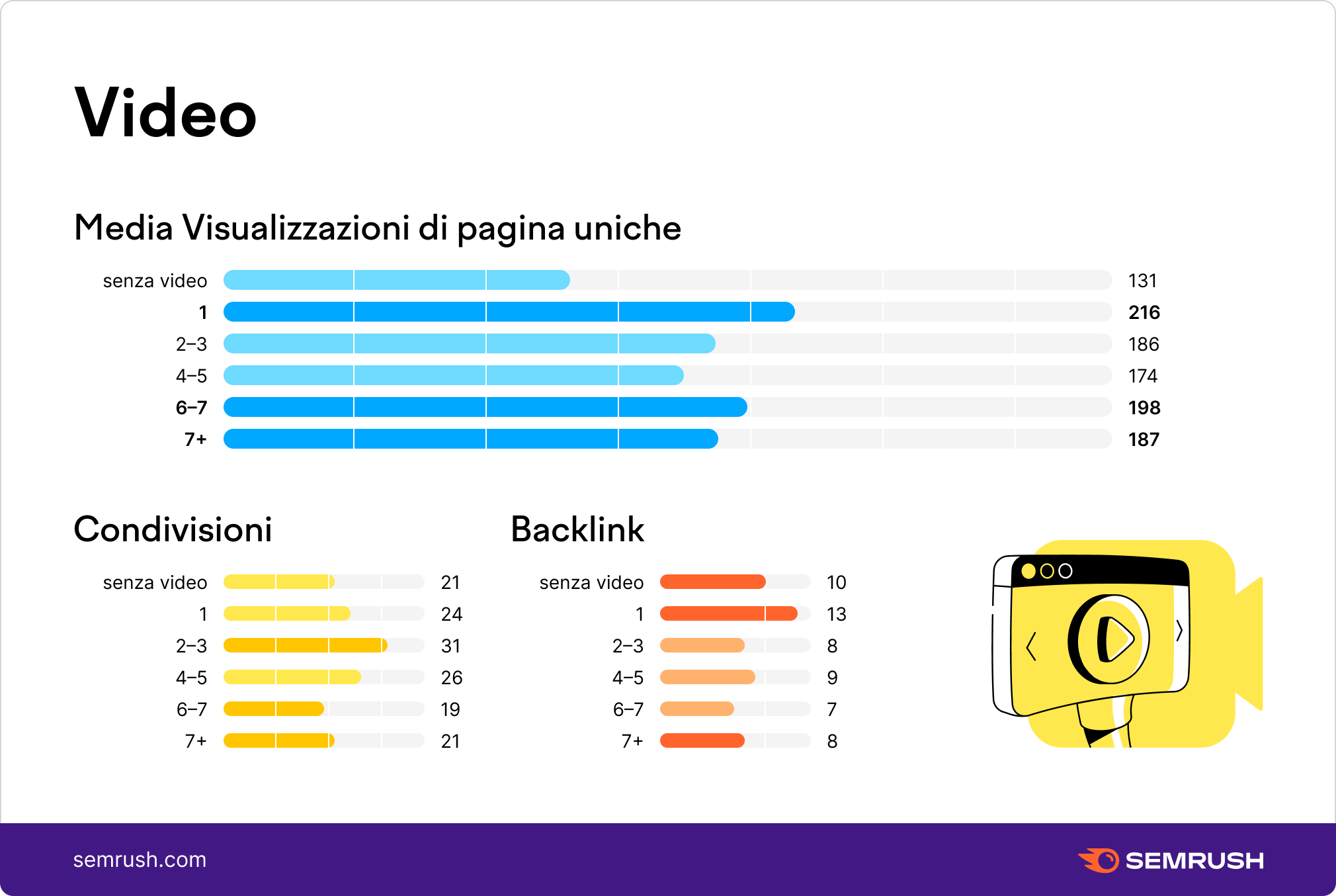 In termini di SEO, l'uso di video nei tuoi post può aumentare anche il coinvolgimento degli utenti, aumentando considerevolmente il tempo trascorso sulla pagina. Se ospiti i video sul tuo sito web (invece che su YouTube o Vimeo), puoi potenzialmente anche attirare molti preziosi backlink.