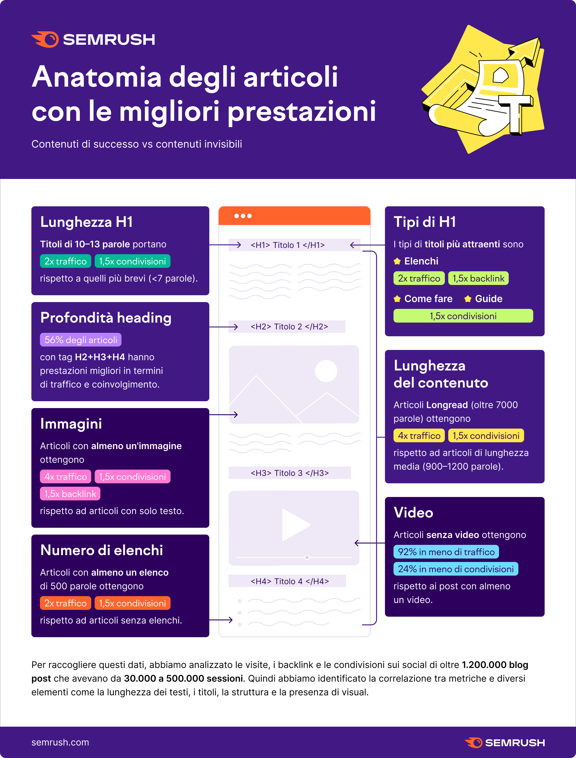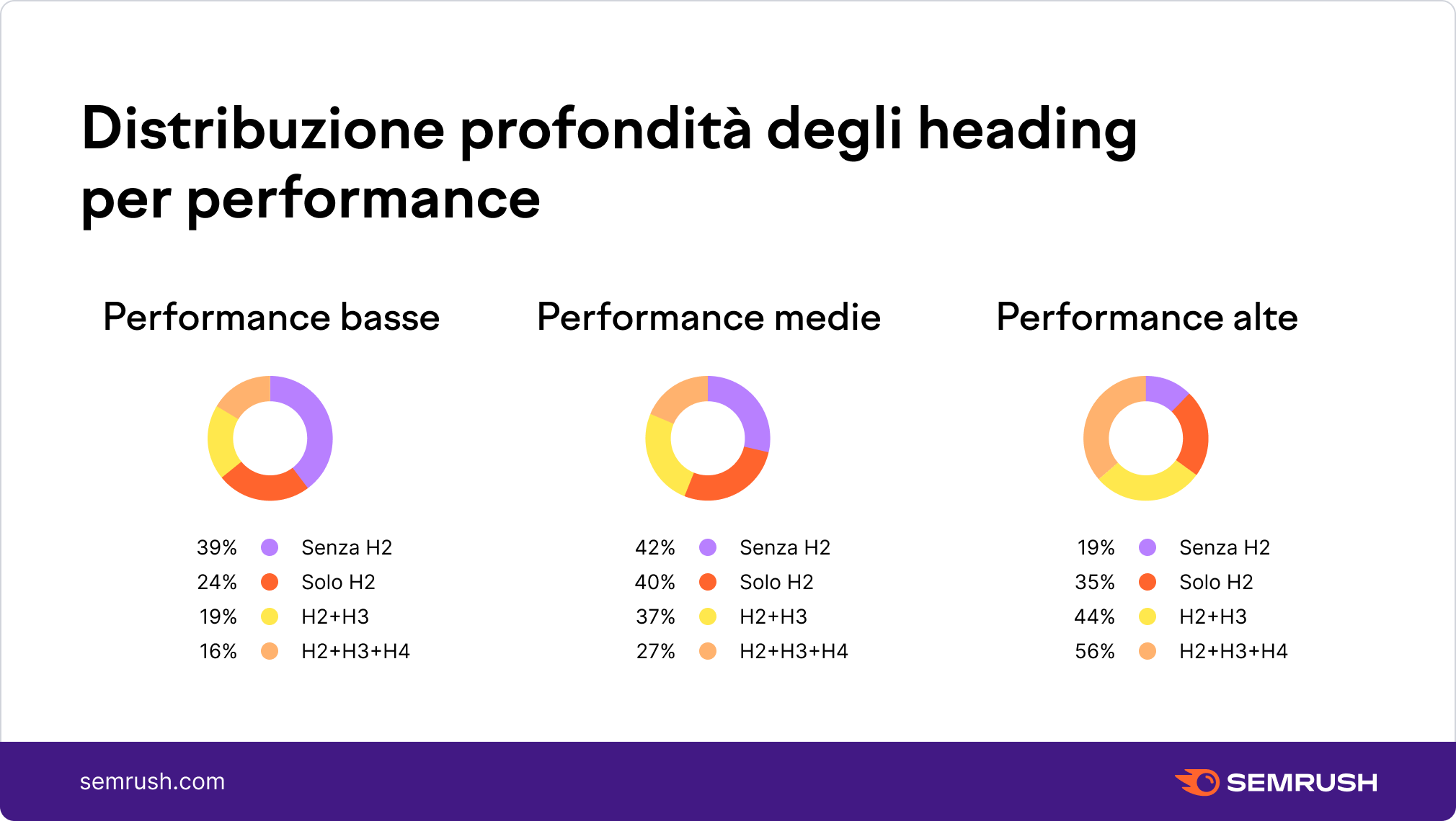 I dati mostrano che una struttura di testo a tre livelli (H2, H3 e H4) è sufficiente per scomporre qualsiasi articolo (anche quelli più lunghi) in parti significative e migliorarne la leggibilità e l'appeal visivo.