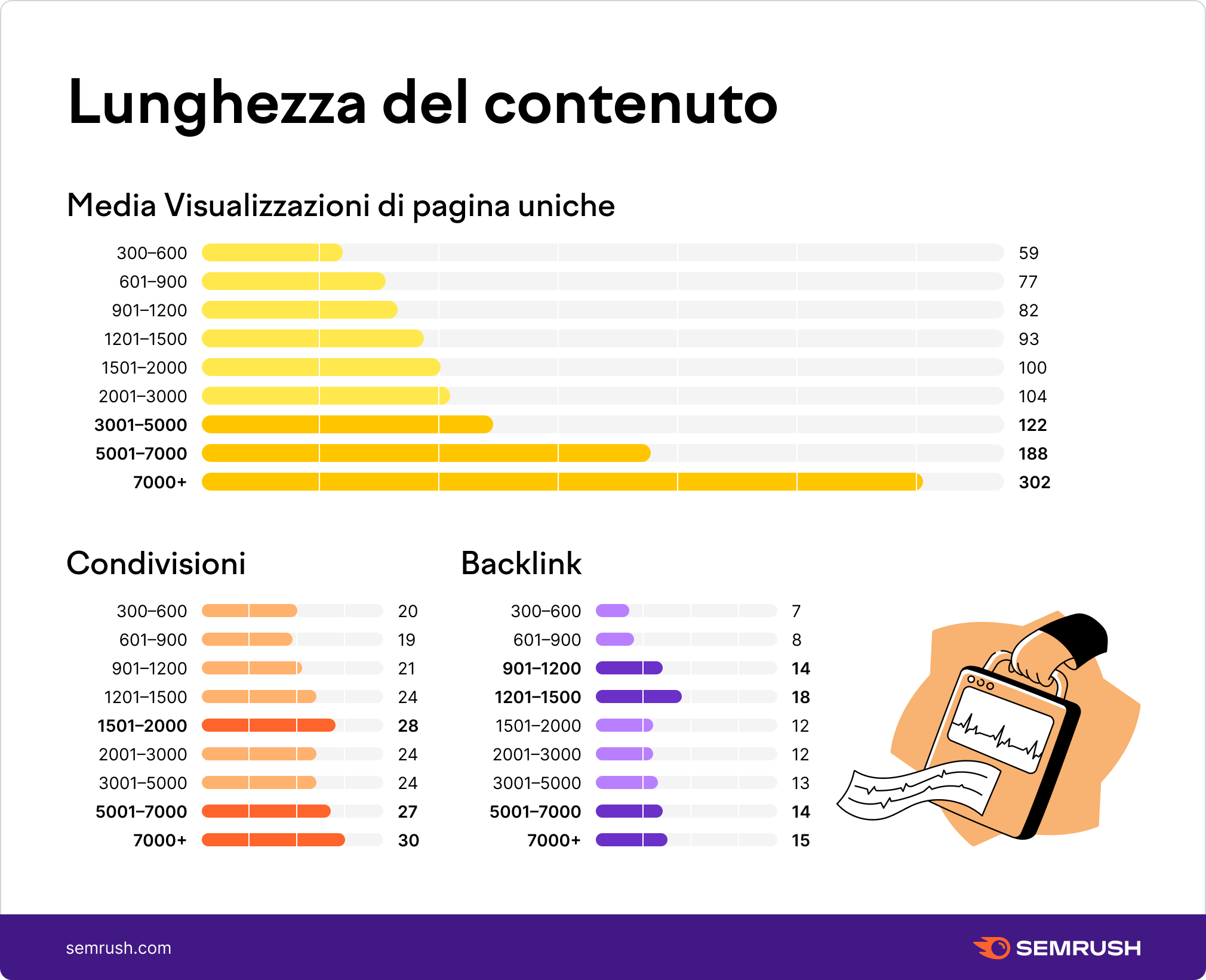 I longread (articoli con oltre 7.000 parole) sono leader assoluti in termini di prestazioni dei contenuti, poiché generano quasi 4 volte più traffico rispetto agli articoli di lunghezza media (900-1.200 parole).