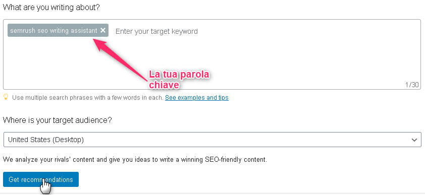 Fatto questo ultimo passaggio: Crea un nuovo articolo e fai il login dalla funzione SEMrush Seo Writing Assistant, che vedi sotto la pagina dell’editor, cliccando sul pulsante "Log in" e subito dopo su Approve. Inserisci la parola chiave sul campo vuoto (Enter your target keyword), e clicca il pulsante Get Recommendations.