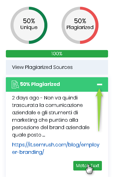 Se nessuno ti ha rubato l’articolo, la percentuale plagiata dovrebbe essere reindirizzata in una unica fonte, ovvero al tuo sito web. Ma se qualcuno ha rubato il tuo articolo per intero, noterai che una percentuale plagiata appartiene ad un’altra URL.