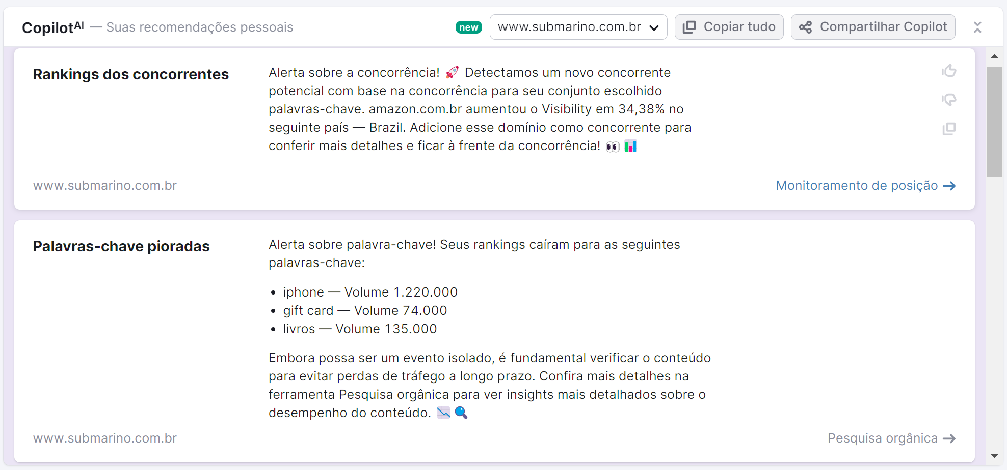 - Visibility Guardian: O Copilot alerta você sobre possíveis problemas de visibilidade, ajudando-o a manter uma presença forte nos resultados de pesquisa.