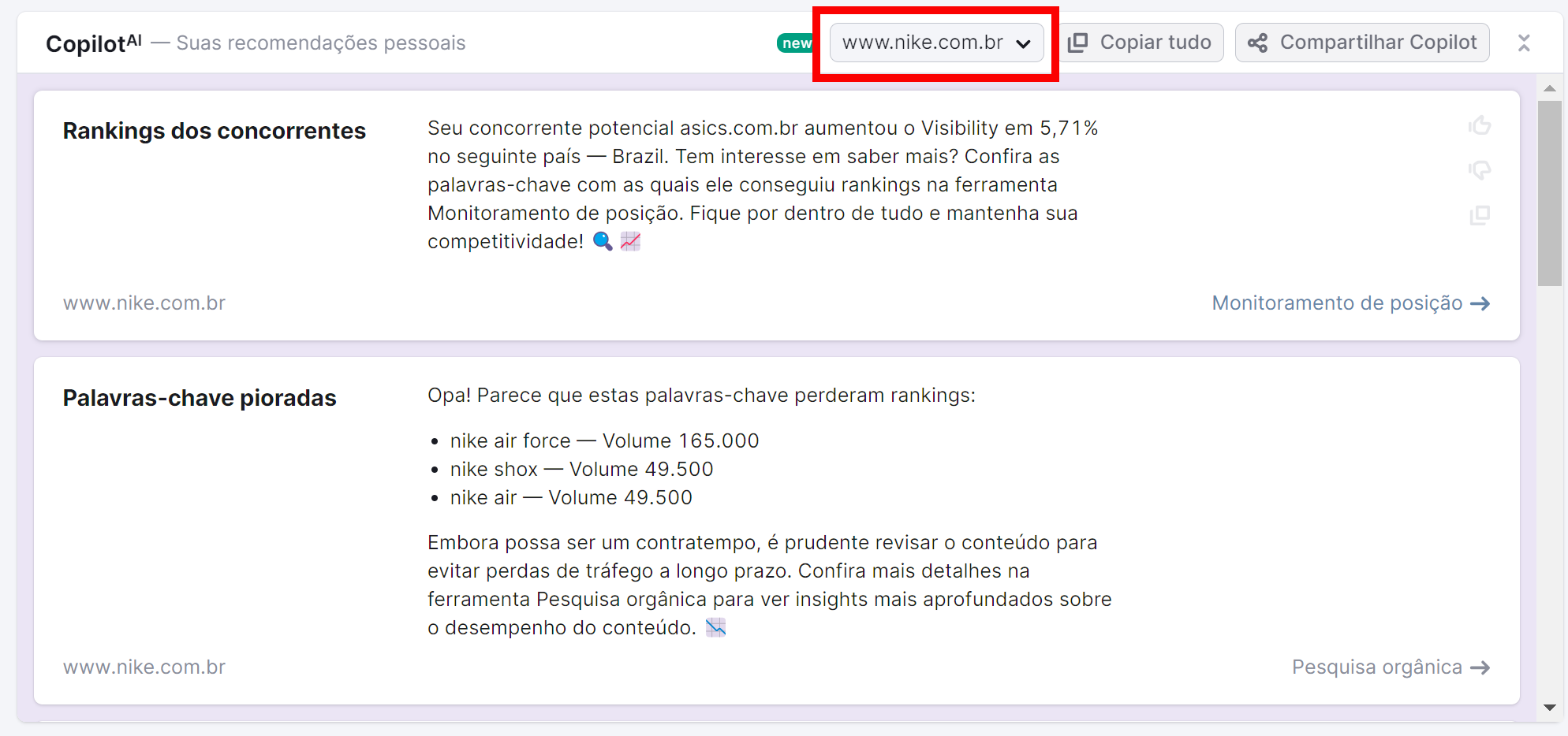 Na parte superior da área do Copilot, você pode optar por visualizar as recomendações de um projeto selecionado ou de todos os seus projetos de uma só vez. Nesse caso, estamos analisando as recomendações para o site da Nike no Brasil.