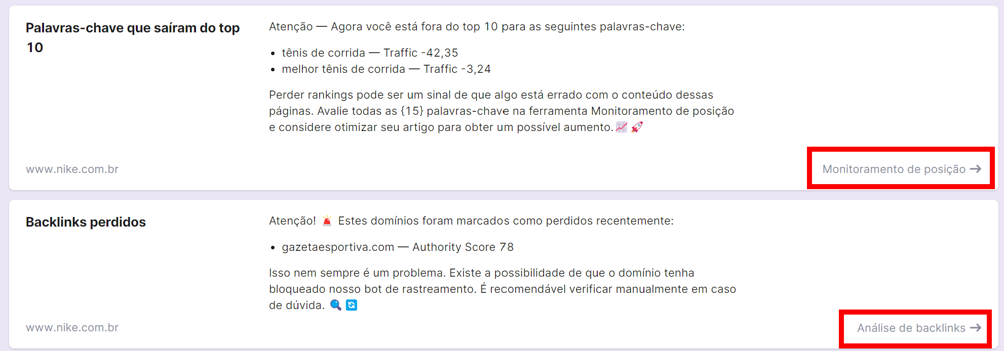 Seu assistente de SEO também fornece sugestões sobre todos os assuntos relacionados a SEO. Isso inclui identificar backlinks perdidos e links quebrados, recomendar novas palavras-chave, destacar aquelas para as quais os concorrentes se classificam e orientar você em relação a oportunidades de saúde técnica.