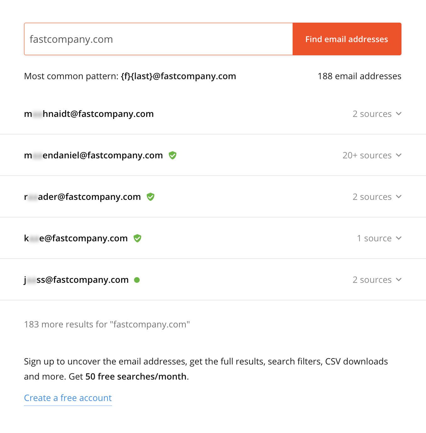 Mesmo sem uma conta, você verá o padrão mais comum para o domínio e terá informações para tentar adivinhar o endereço, caso só saiba o nome do jornalista. Também é exibida uma lista de fontes junto aos resultados, o que ajuda a confirmar o endereço de e-mail ou o formato correto.