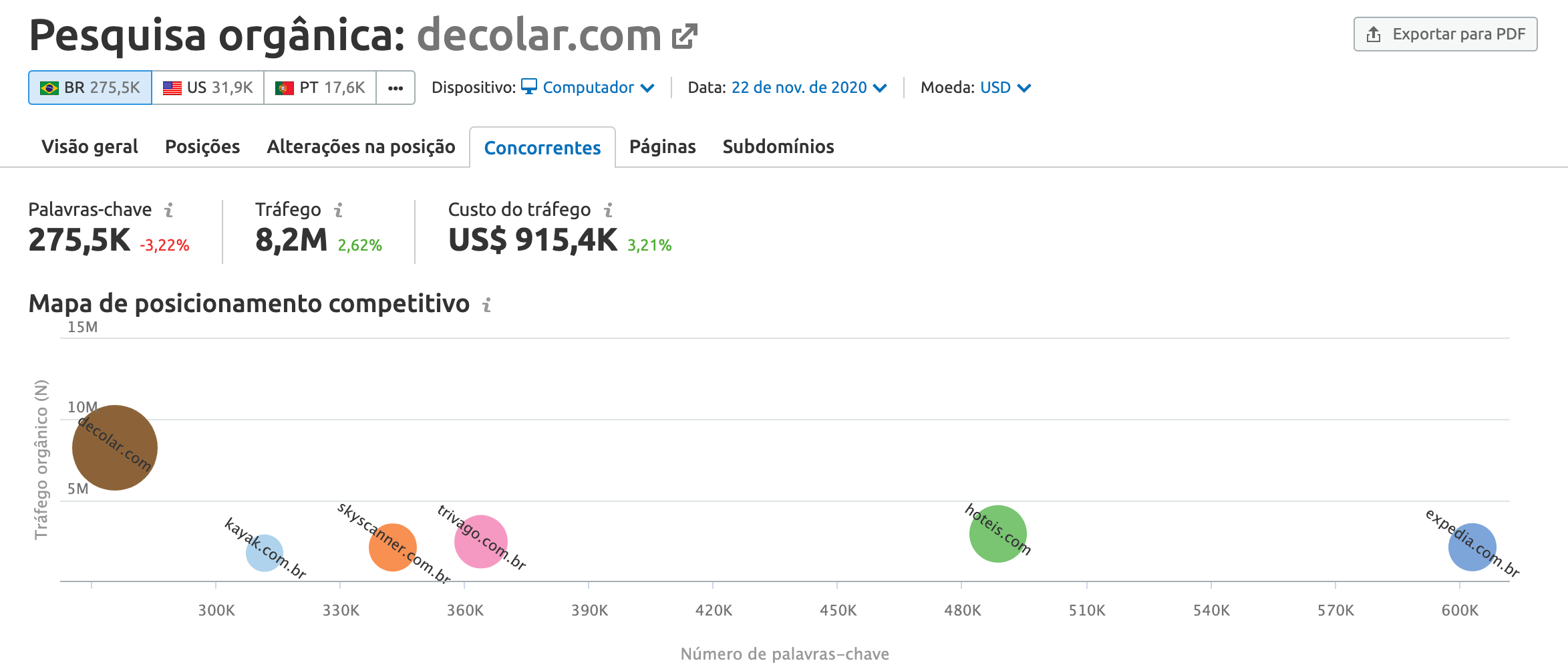 Por outro lado, outro blog de viagem de tamanho parecido irá competir com você. Preste atenção especial aos concorrentes cujos sites competem mais com o seu em termos de tráfego e número total de palavras-chave.