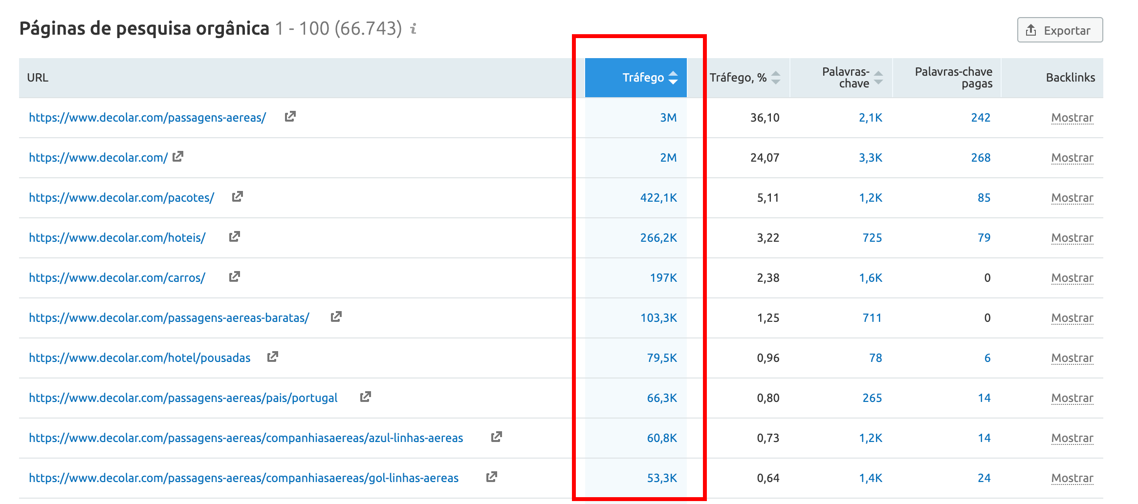 Esse relatório mostrará a porcentagem de tráfego que uma URL específica do concorrente recebe e o número de palavras-chave com as quais a página se posiciona. É possível investigar cada uma das URLs listadas para analisar qual é seu principal conteúdo e como ele é estruturado para atrair leitores e se classificar bem no Google.