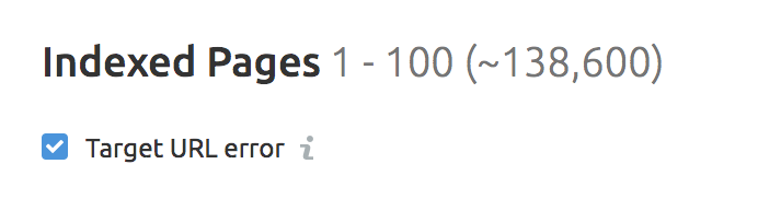 Digite seu domínio na ferramenta e vá para a aba 'Páginas indexadas', certificando-se de marcar a caixa 'Erro na URL de destino':