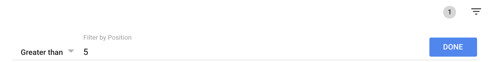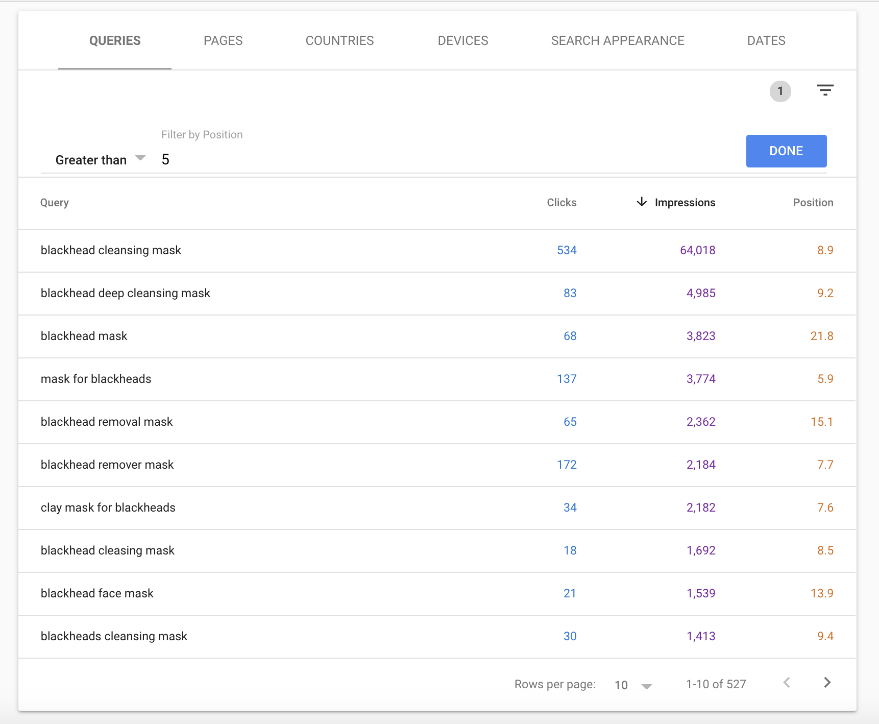 Aqui, você pode visualizar todas as consultas de pesquisa e os dados relevantes (impressões, cliques e posição média para um URL específico). Filtre a tabela por 'posição' para ver os termos mostrados na parte de baixo da página 1 ou ainda mais abaixo:
