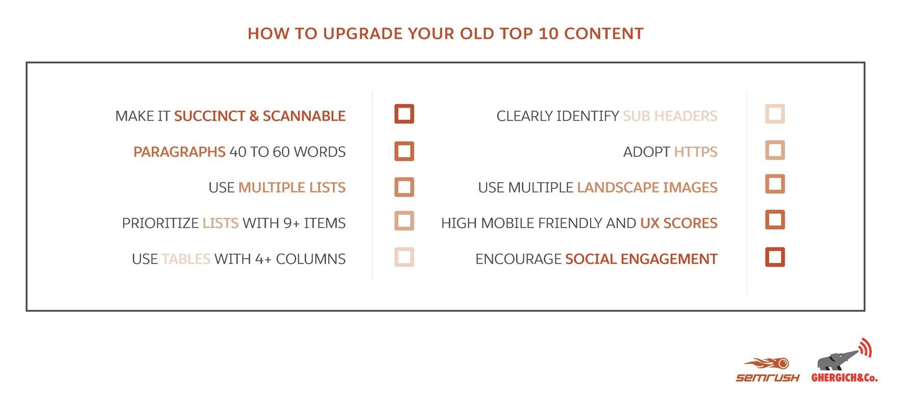 Uma ótima tática que você pode usar é fazer uma auditoria de conteúdo para descobrir essas páginas que estão atrapalhando o restante do seu site. Em nosso checklist de SEO recomendamos fazer auditorias recorrentes do seu conteúdo, afirmando que: